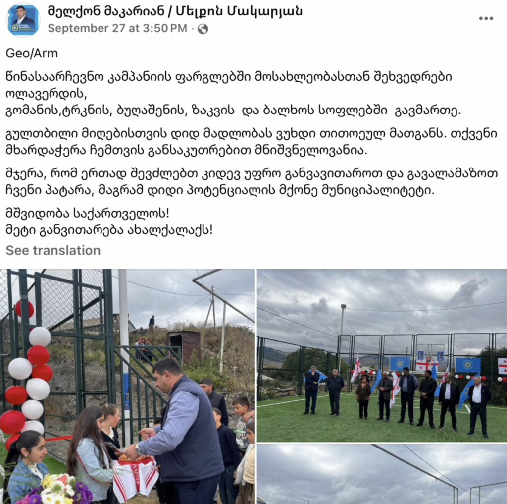 მელქონ მაკარიანის წინასაარჩევნო პოსტერები, ახალქალაქის სოფელ ზაკვში მუნიციპალიტეტის მიერ მოწყობილი სპორტულ მოედანზე, კალათბურთის ფარზეა გაკრული. ის, რომ სპორტული მოედანი მუნიციპალიტეტის ბიუჯეტიდან დაფინანსდა გვიდასტურებენ, ქალაქის მერიაში.