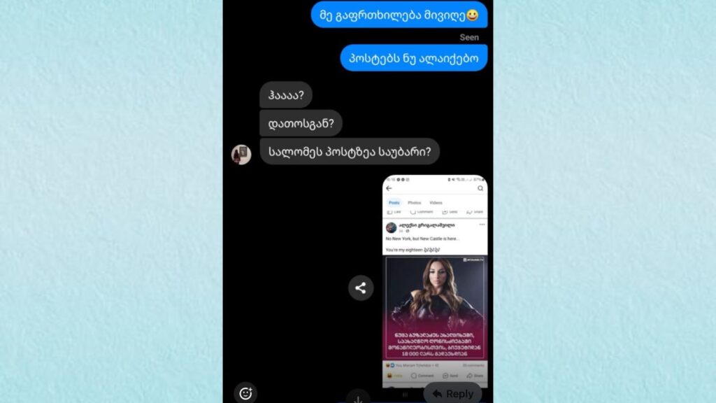 ევა: – “ვიღაცა ვიღაცას წერს მესიჯებს. ნებისმიერს შეუძლია შექმნას ახალი ექაუნთი, ნებისმიერი სახელითა და ინიციალით. ერთმა და იგივე ან თუნდაც სხვადასხვა პიროვნებამ გარკვეული მესიჯებში გაუგზავნოს ერთმანეთს.”