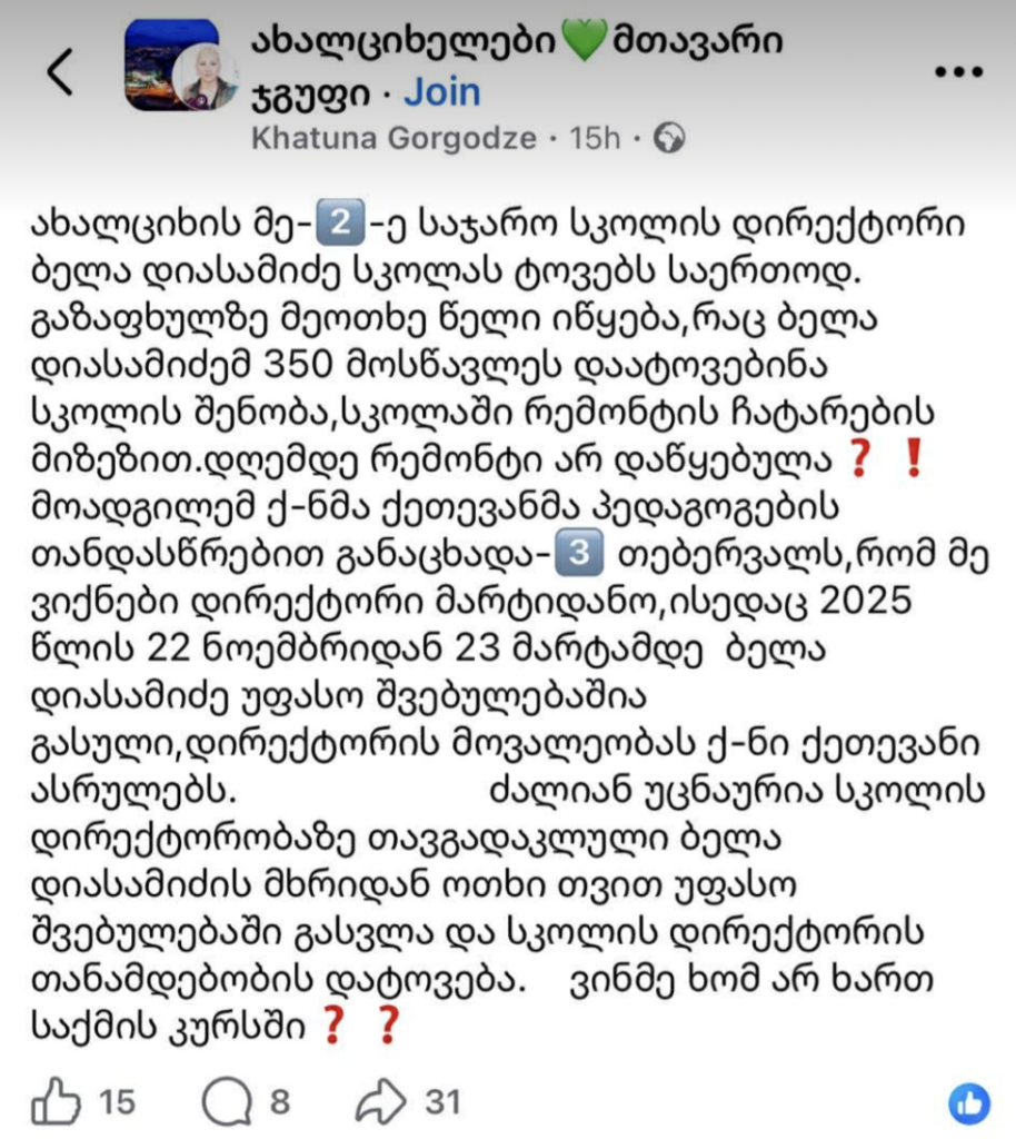 განათლების სამინისტროში გვეუბნებიან, რომ ახალციხის II სკოლის დირექტორი მართლაც იმყოფება შვებულებაში, თუმცა თანამდებობა არ დაუტოვებია.