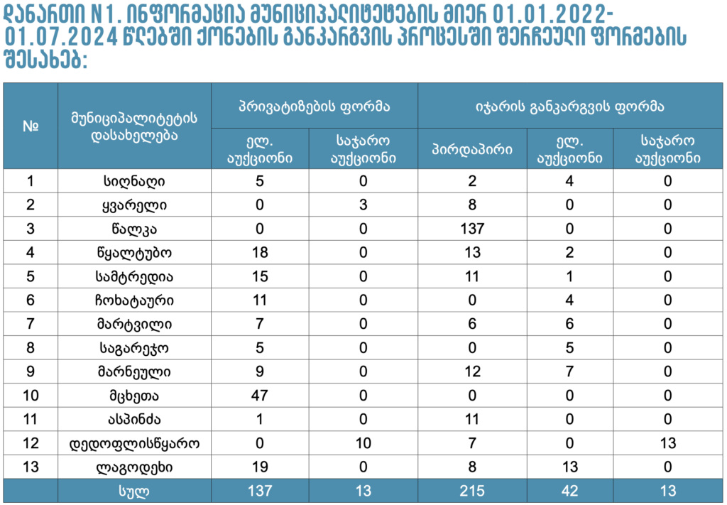 2022-24 წლებში, წალკის მერიამ, 137 მუნიციპალური უძრავი ქონება, პირდაპირი განკარგვის წესით, აუქციონის გარეშე გააქირავა და ჯამში 570 000-ზე მეტი ლარის შემოსავალი მიიღო,- კვლევას სახელმწიფო აუდიტის სამსახური ავრცელებს.