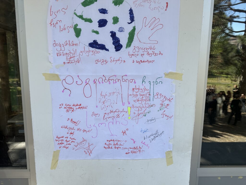 ფოტოები: მეორე საჯარო სკოლის მოსწავლეებმა, სკოლაში დაბრუნების მოთხოვნით, სხვადასხვა შინაარსის პოსტერები დაამზადეს და კედლებზე ჩამოკიდეს.