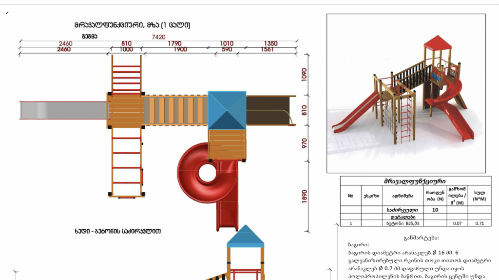სატენდერო დოკუმენტის მიხედვით, თაყაიშვილის ქუჩა N90-ის მიმდებარე ტერიტორიაზე იგეგმება სპორტული მოედნის მოწყობა და შესაბამის ინვენტარით აღჭურვა, სპორტული ტრენაჟორების, საქანელის და მულტიფუნქციური ატრაქციონის მოწყობა.